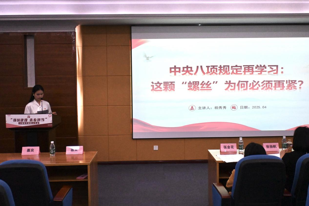 党员同学们从不同角度出发,用生动案例和真挚话语,阐释党的理论,抒发青年担当。郭洪志同学讲述雷达技术背后青年科研人员的奋斗故事,展现科技报国的坚定决心;熊雅倩同学深入剖析历史,以古鉴今,强调作风建设的重要性。他们的精彩讲解赢得阵阵掌声。