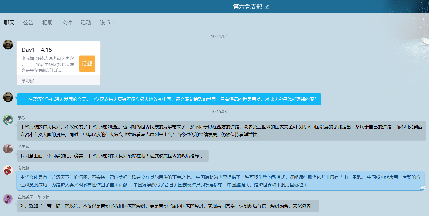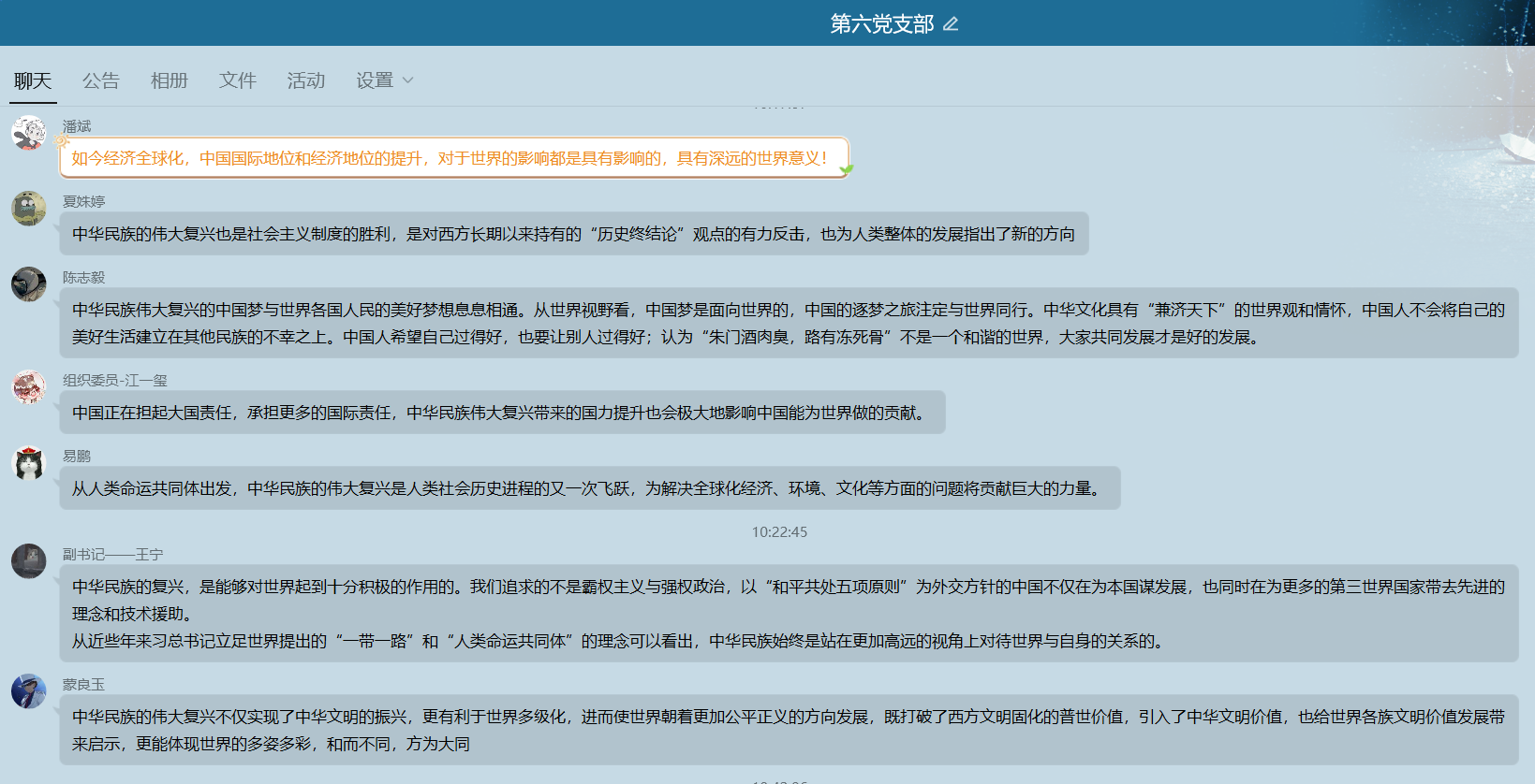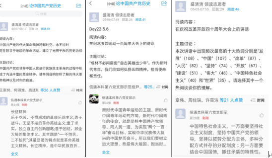 此外,对于领读员和导师每天发布的话题,六支部的同学们都会积极评论,表达自己对红色精神的理解,讲述自己身边的党员故事。同时,支部党员们把一些跟时政有关的话题转发到支部交流群内,供同学们交流讨论。同学们各抒己见,对于学习党史的意义也有了更深刻的认识。读史使人明智,学习党史,让我们更加坚定对中国特色社会主义的信心,时刻铭记我党从哪里来,到哪里去。深入学习党史,守共产党人的初心,方能担当起时代的使命。