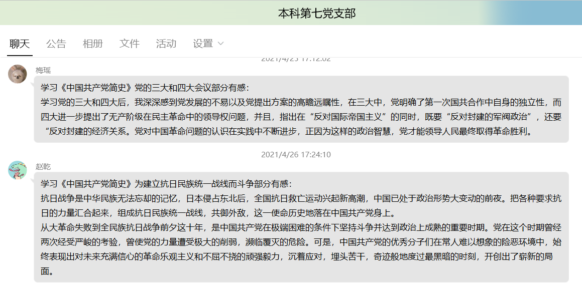 4月15日,七支部积极响应公司“迎建党百年共读活动”,成立阅读示范组,组织全体支部党员共同阅读《中国共产党简史》一书。在为期一个月的共读时间里,党员们每天都坚持阅读,并在党支部群里轮流分享阅读感悟,形成了良好的学习交流党史的氛围。除了线上学习,党员也在线下也各自撰写了一段读书笔记,并由支部骨干将其装订成册,形成了一本具有支部特色的学习语录。