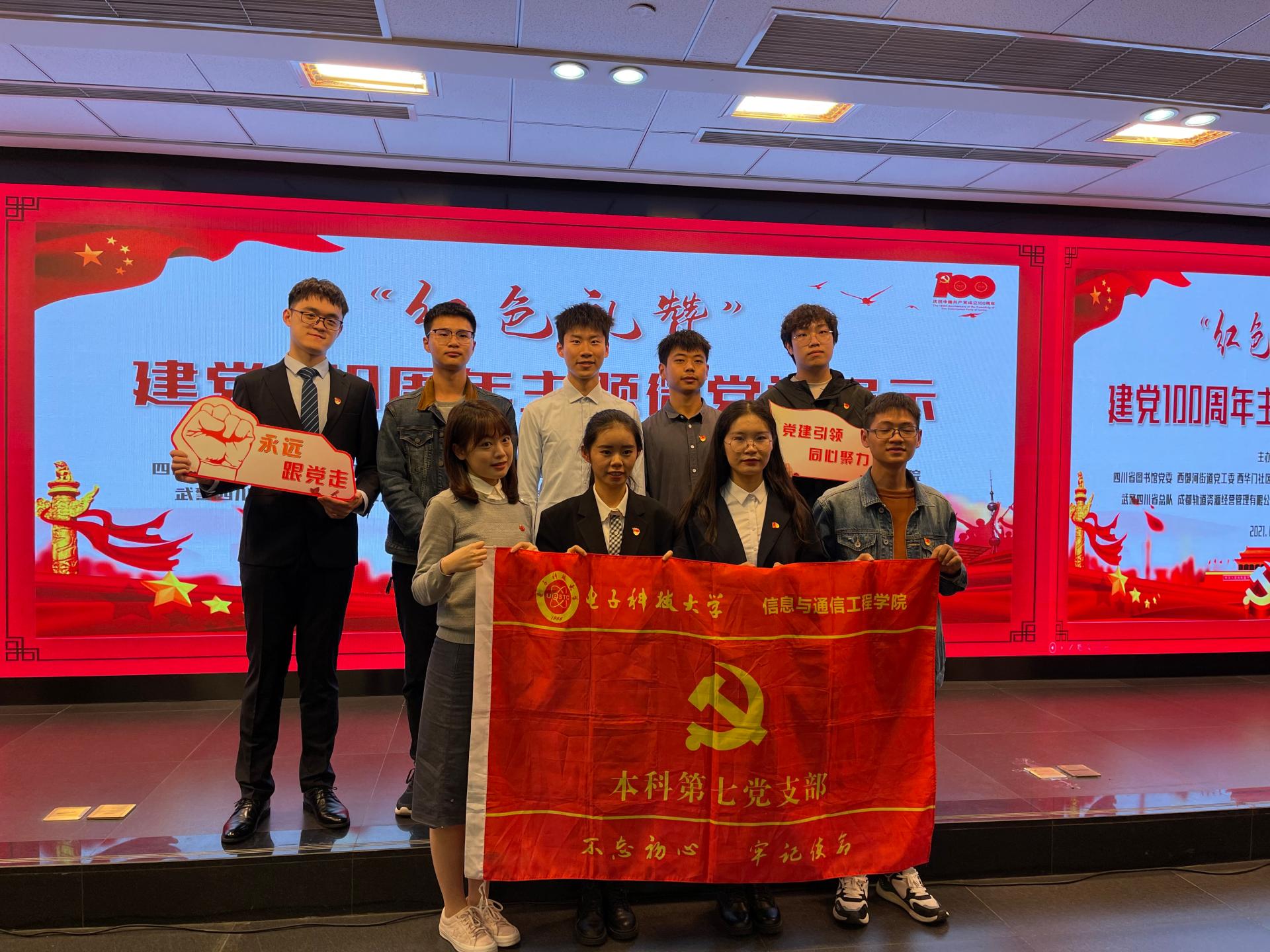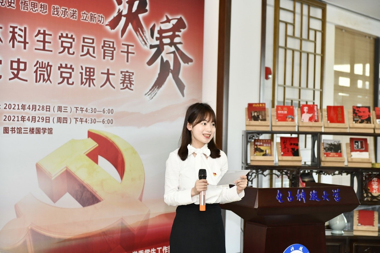 集团的本科生党员骨干党史微党课大赛决赛于4月28、29日下午在图书馆三楼国学馆举行,第七党支部的王一竹同学以《走长征路,歌奋斗史》为主题,通过宣讲和红歌相结合的方式,带领大家一起回望革命先辈们在苦难辉煌岁月中如何坚持初心与使命,并鼓励成电青年要弘扬长征精神,书写精彩人生,最终获得微党课大赛一等奖。