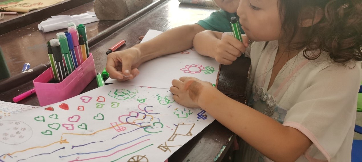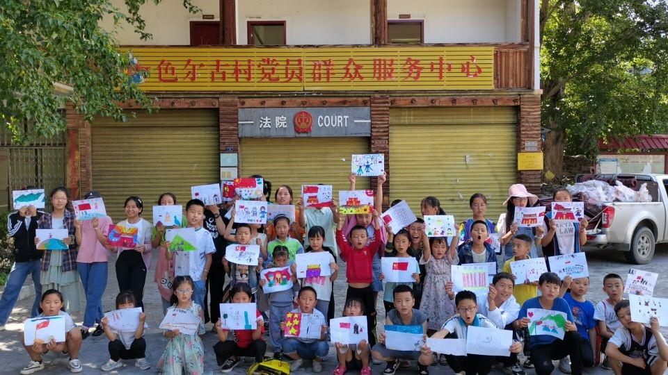 启发创造,恣意表达,美术是记录精彩瞬间的胶卷,也是诉说内心思绪的便签。四川分队所在的支教点有着来自不同民族的员工,队员们便让孩子们画出自己心中的“民族大团结”,孩子们稚嫩的画风下是鲜活的想象力,简单的画面无不反映出他们对今日民族团结纯粹而阳光的认识,青春的活力与朝气让我们不禁畅想起祖国光明的未来;陕西分队选择让孩子们洞察日常美好,绘之以画笔,天马行空的想法在鼓励下被勇敢地表达出来,他们沉浸其中,享受绘画的过程,队员们也感知到了孩子们的热忱之心。