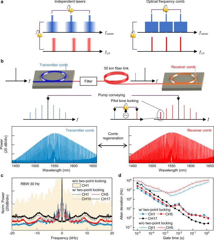 新葡的京集团35222vip邱昆教授团队与基础与前沿研究院周强教授、邓光伟教授团队合作,在国际著名期刊Nature Communications(《自然·通讯》)上发表题为“Coherent optical communications using coherence-cloned Kerr soliton microcombs”的论文。该研究采用片上集成克尔光频梳,分别作为数据发送端的多波长载波光梳,以及数据接收端的多波长本振光梳,并通过泵浦传递、两点锁定、光学分频等创新技术,实现了载波光梳与本振光梳的频率相位锁定,在50km距离间隔条件下多个载波与本征之间拍频线宽<100Hz,从而显著地降低了相干光通信中频率估计和相位补偿算法的复杂度,有望促进波分复用光通信系统的频率规范度从GHz朝Hz量级演进,为解决光通信系统目前面临的“功耗恐慌”提供了一种可能的解决方案,并有望应用于远距离时频传递、双场量子密钥分发等技术领域。