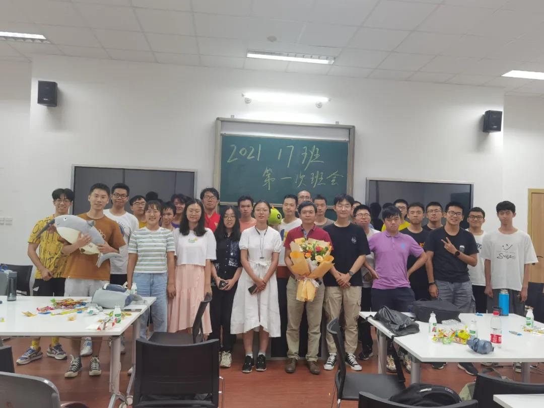 张浩天(左二)和新葡的京集团35222vip2020级17班同学们在大二学年的第一次班会