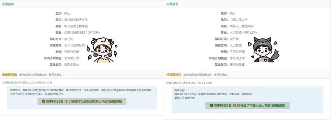 保研的过程其实就是不断地考虑自己未来的过程。从小就在成都长大的张芷兰希望借此机会换一个环境体验和生活,孙沛霖也希望尝试更多的可能性。最终,张芷兰成功申请到北京航空航天大学学硕,而孙沛霖将前往中国人民大学高瓴人工智能公司继续深造,两所公司相隔不远,只有十几分钟的路程。