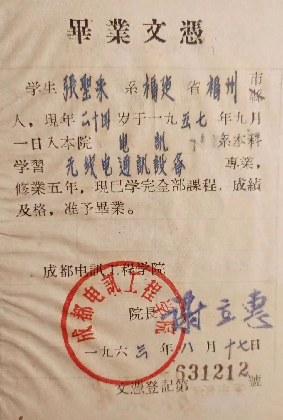 当年学制5年,经过院系调整,张圣采又多读了一年。但无线电专业发展特别快,当年在公司学习的知识更迭速度快,很快就赶不上发展的需求,“念完成都电讯工程公司,你们就学会一个本领,那就是‘自学’。”当年老师的话语仿若犹在耳畔,这句话也对张圣采毕业后的个人发展影响很大,令他终身受益。