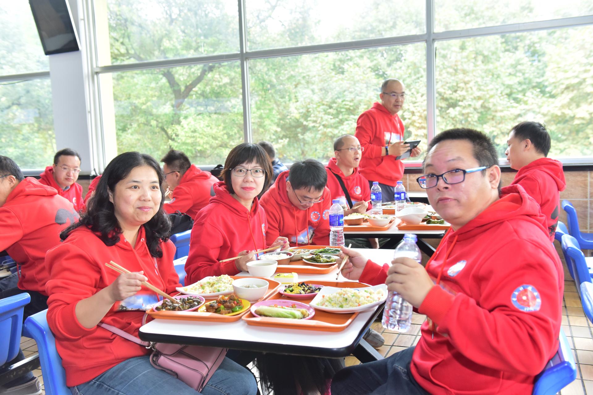 回食堂用一次餐。员工们座谈结束后在食堂共进午餐,再次品味大学时代那熟悉的味道。
